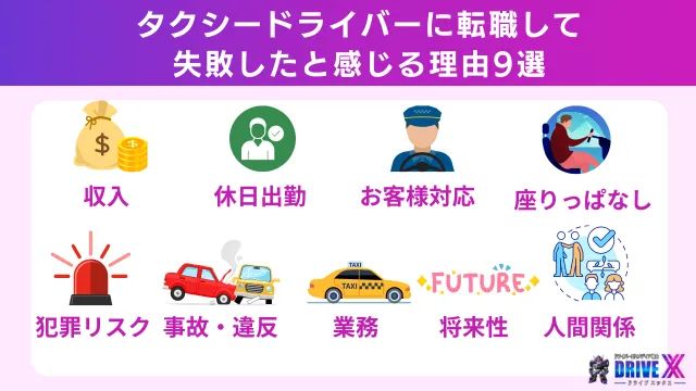 タクシードライバーに転職した方が「失敗した」と感じる主な理由を9つ紹介します。