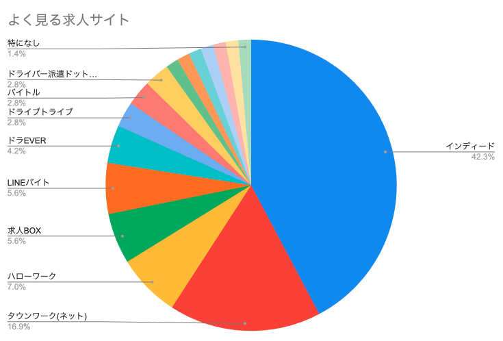 一方で、タウンワーク(ネット)が約2割、ハローワークが1割弱、 求人BOX・LINEバイト・バイトルといったサービスもそれぞれ一定数利用されており、 複数の求人サービスが併用されています。