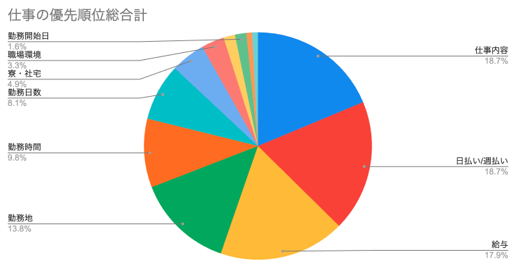 仕事選びの優先順位を見ると、「仕事内容」「日払い・週払い」「給与」がほぼ同水準で並んでいます。