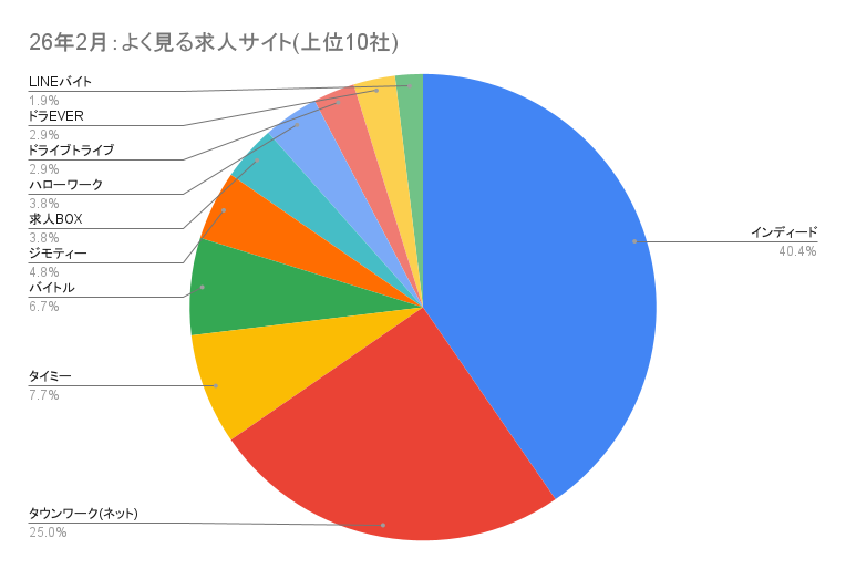 2月の結果では、Indeedが主要な情報接点となっており、タウンワーク(ネット)も引き続き利用されています。 そのほか、タイミーやバイトル、ジモティーなども一定数利用されており、求職者は複数媒体を横断しながら仕事を比較しています。