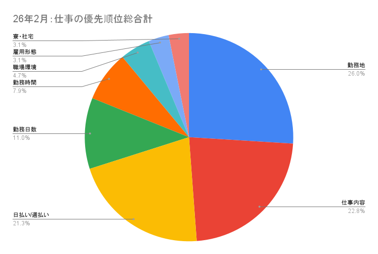 2月の優先順位では、「給与」「勤務地」「仕事内容」が上位を占めています。 収入面だけでなく、通いやすさや業務内容を含めて総合的に判断している様子がうかがえます。