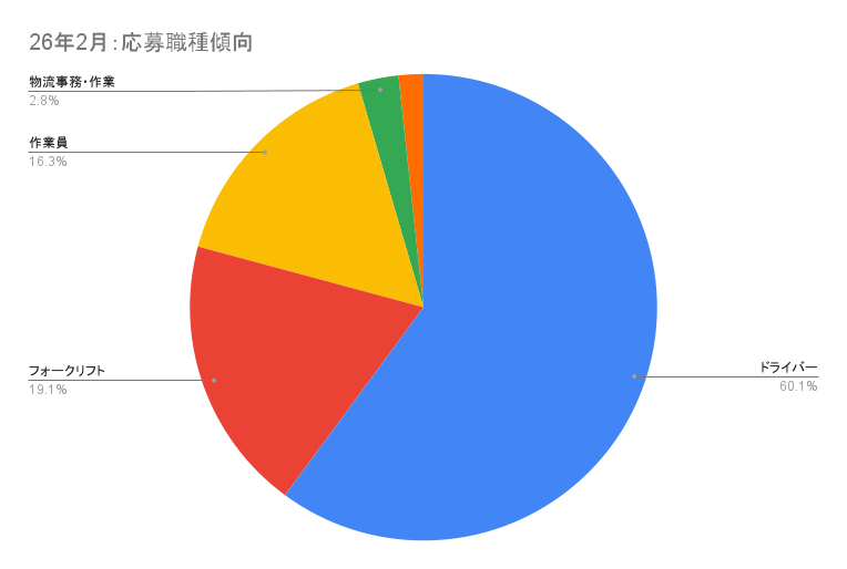 2026年2月の応募職種を見ると、ドライバー職が全体の約6割を占めており、引き続き採用市場の中心となっています。 フォークリフトや作業員などの物流現場系職種も一定数を占めており、現場系全体でのニーズが継続していることが分かります。