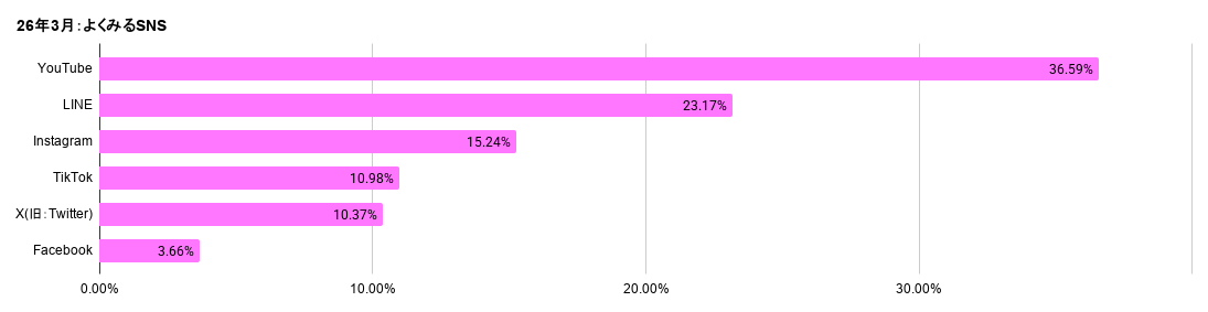 SNSの利用状況では、YouTubeが36.59%と最も高く、動画による情報収集が主流になっていることがわかります。