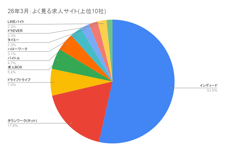ただし、タウンワークは17.83%、ドライブトライブは6.98%、求人BOXは5.43%、バイトルは4.65%、ハローワークは3.10%となっており、求職者は1つの媒体だけで仕事を探しているわけではありません。