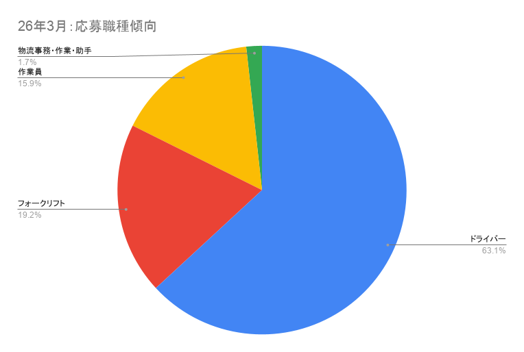 2026年3月の応募内訳では、ドライバーが63.12%と過半数を占めており、依然として採用の中心であることに変わりはありません。