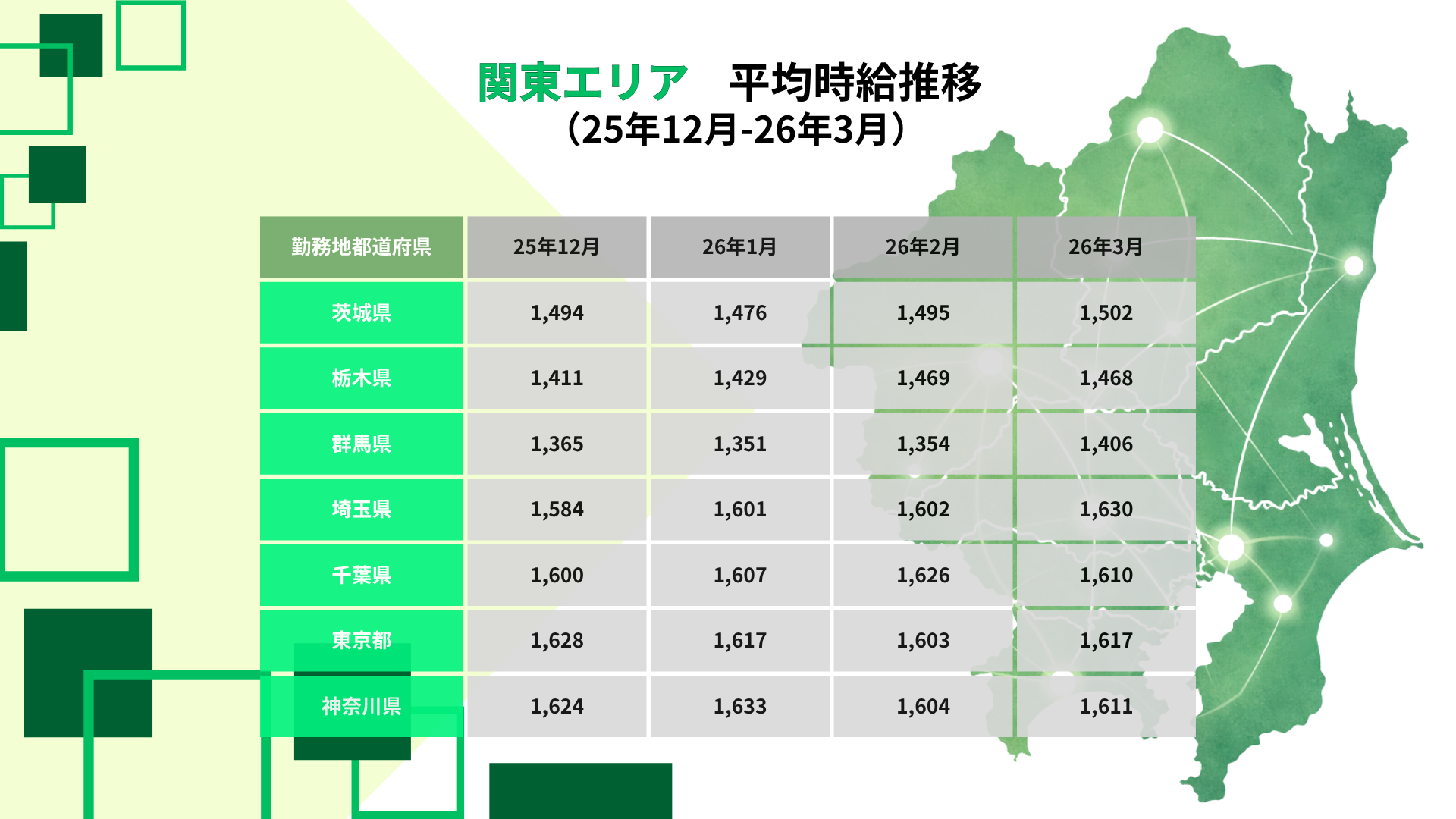 関東エリアは全国トップ水準の時給を維持しており、埼玉1,630円、東京1,617円と高水準です。