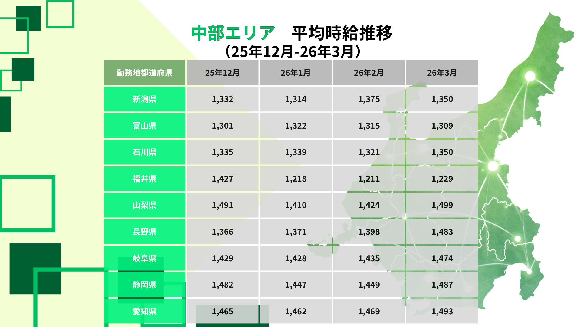 中部エリアは、製造業物流の影響を受けやすく、時期によって求人構成が変化しやすい特徴があります。