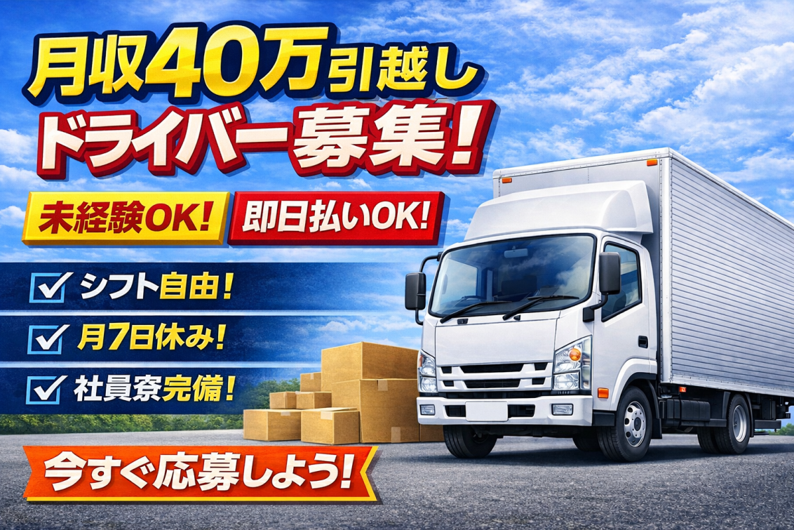 引越しドライバーで月収40万円以上★未経験歓迎★即払いOK&作業終了次第帰宅できる働きやすい環境です。