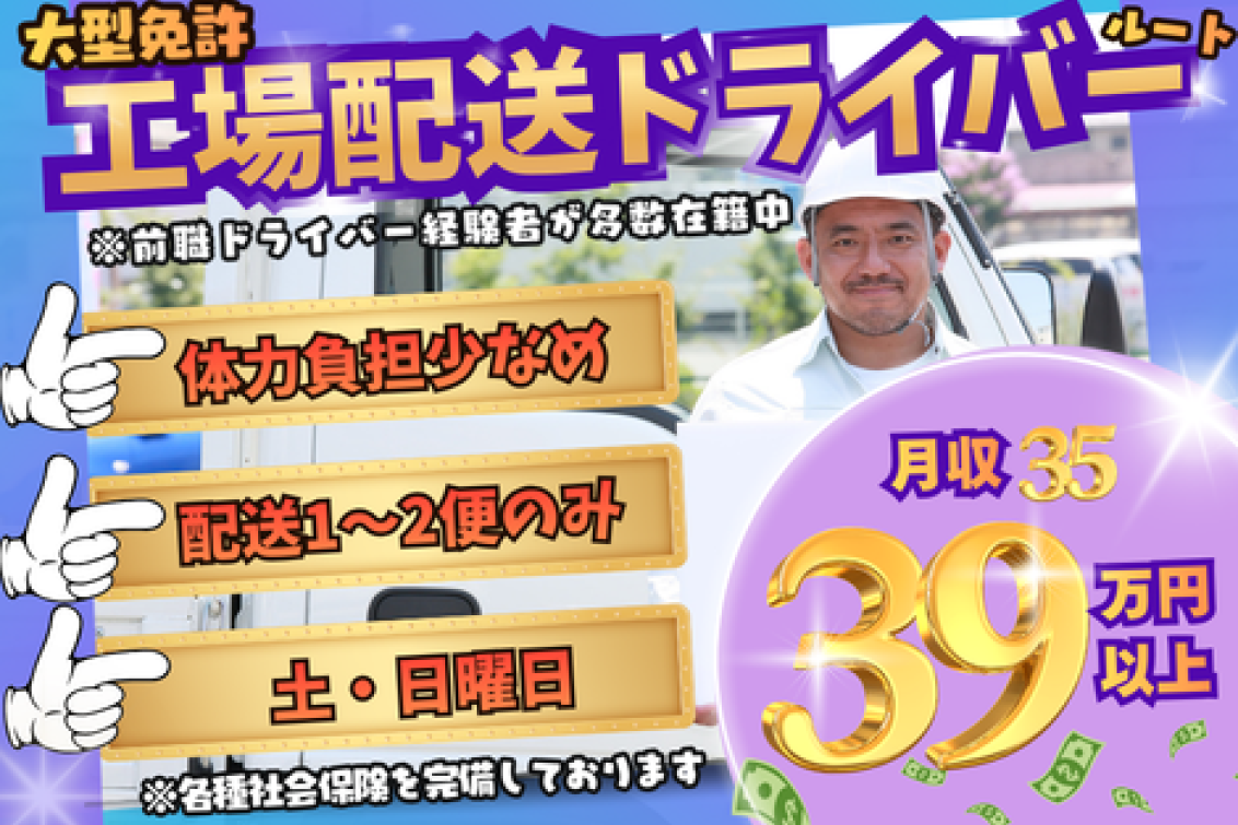 大型トラックを使用し、広島県・山口県および九州エリアの工場へ製品を配送するお仕事です。